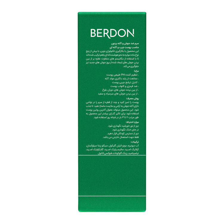 سرم ضد جوش و آکنه بردون یک محصول مؤثر و کارآمد برای افرادی است که پوست چرب و مستعد آکنه دارند. این سرم با کنترل چربی پوست، کاهش التهاب و کوچک کردن منافذ باز به درمان و پیشگیری از جوشها کمک میکند و پوستی صاف، شفاف و بدون آکنه به شما میدهد. استفاده منظم از این سرم به شما کمک میکند تا از جوشهای جدید جلوگیری کرده و جوشهای فعال را درمان کنید.