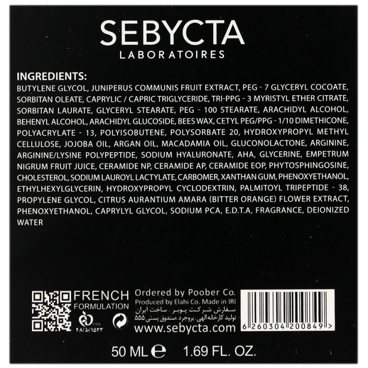 بوتیلن گلایکول، عصاره میوه کاج جونی پروس کامونیس، پی ای جی-7 گلیسریل کوکوات، سوربیتان اولئات، کاپریلیک/ کاپریک تری گلیسرید، تری-پی پی جی-3 میریستیل اتر سیترات، سوربیتان لورات، گلیسریل استئارات، پی ای جی-100 استئارات، آرشیدیل الکل، بهنیل الکل، آرشیدیل گلوکوزید، موم زنبور عسل، ستیل پی ای جی/پی پی جی-10/1 دایمتیکون، پلی آکریلات 13، پلی ایزو بوتن، پلی سوربات-20، هیدروکسی پروپیل متیل سلولز، روغن جوجوبا، روغن آرگان، روغن ماکادمیا، گلوکونولاکتون، آرژنین، آرژنین/لیزین پلی پپتید، سدیم هیالورونات، آلفا هیدروکسی اسید، گلیسیرین، عصاره میوه امپتروم نیگروم، سرامید ان پی، سرامید ای پی، سرامید ای او پی، فیتواسفنگوزین، کلسترول، سدیم لوریل لاکتیلات، کربومر، زانتان گام، فنوکسی اتانول، اتیل هگزیل گلیسرین، هیدروکسی پروپیل سیکلو دکسترین، پالمیتوئیل تری پپتید-38، پروپیلن گلایکول، عصاره گل بهار نارنج، فنوکسی اتانول، کاپریلیل گلیکول، سدیم پی سی ای، ا.د.ت.آ، اسانس مجاز آرایشی و بهداشتی، آب دیونیزه.