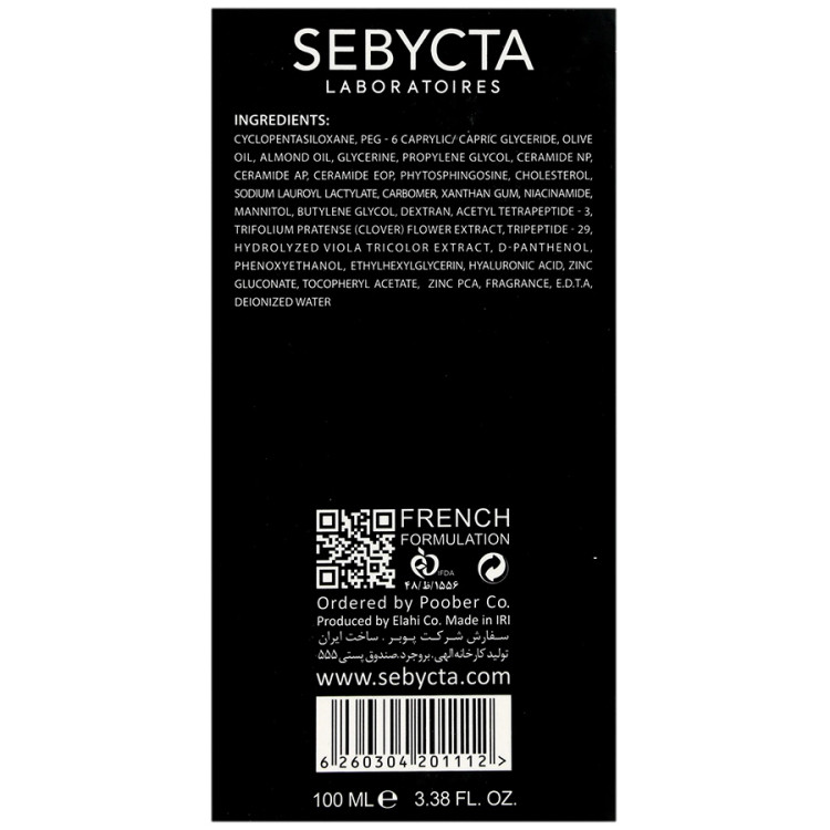 سیکلو پنتا سیلوکسان، پی ای جی -6 کاپریلیک/ کاپریک گلیسیرید، روغن زیتون، روغن بادام، گلیسیرین، پروپیلن گلایکول، سرامید ان پی، سرامید ای پی، سرامید ای او پی، فیتوسفینگوسین، کلسترول، سدیم لوریل لاکتیلات، کربومر، زانتان گام، نیاسینامید، مانیتول، بوتیلن گلایکول، دکستران، استیل تترا پپتاید-3، عصاره گل تریفولیوم پرتنس (کلاور)، تری پپتاید-29، عصاره هیدرولیز شده ویولا تری کالر، دی پنتنول، فنوکسی اتانول، اتیل هگزیل گلیسیرین، هیالورونیک اسید، زینک گلوکونات، توکوفریل استات، زینک پی سی ای، اسانس مجاز آرایشی و بهداشتی، ا.د. ت. آ، آب دیونیزه.